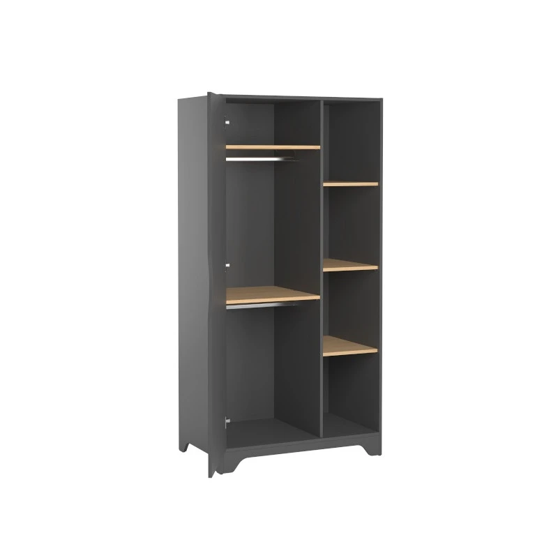 L’armoire 1 porte VOX Leaf graphite /bois vous offre de beaux volumes permettant de ranger et d’organiser la garde robe de votre bout de chou. Une grande porte cache deux étagères réglables en hauteur, où bien empiler les vêtements et deux penderies, pour suspendre les tenues les plus fragiles. De l’autre côté, un espace ouvert comprend 3 étagères pouvant recevoir décorations, peluches, livres… ou paniers susceptibles d’abriter chaussettes et bodies, par exemple.