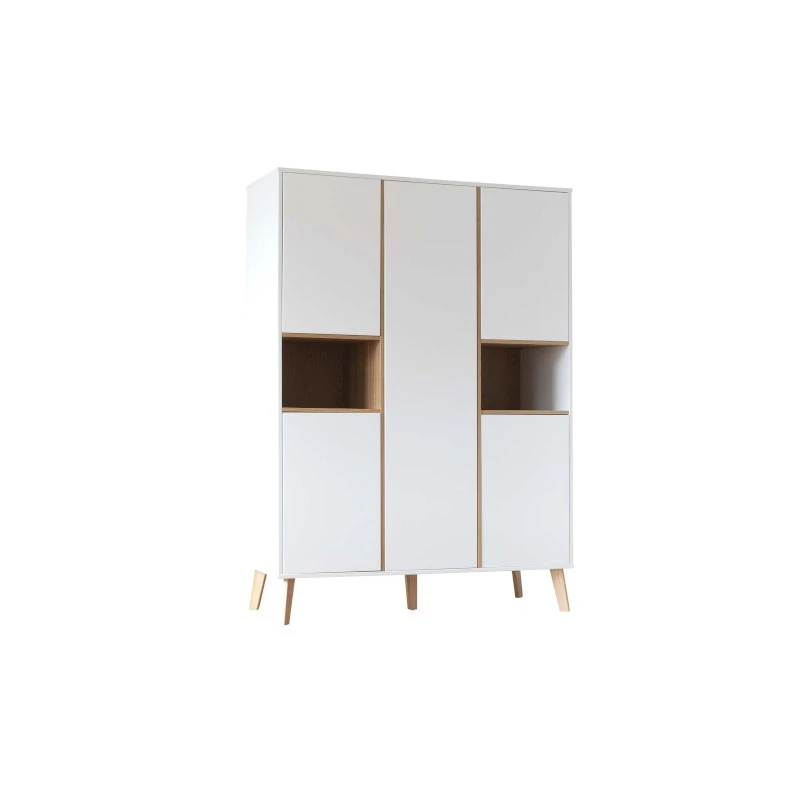 L’armoire 5 portes Périclès Style blanc dispose de lignes droites et modernes, adoucies par les pieds obliques. Elle associe harmonieusement la lumineuse couleur blanche avec des touches de ton bois, sur les séparations verticales, à l’intérieur des niches ou sur les pieds en pin massif.