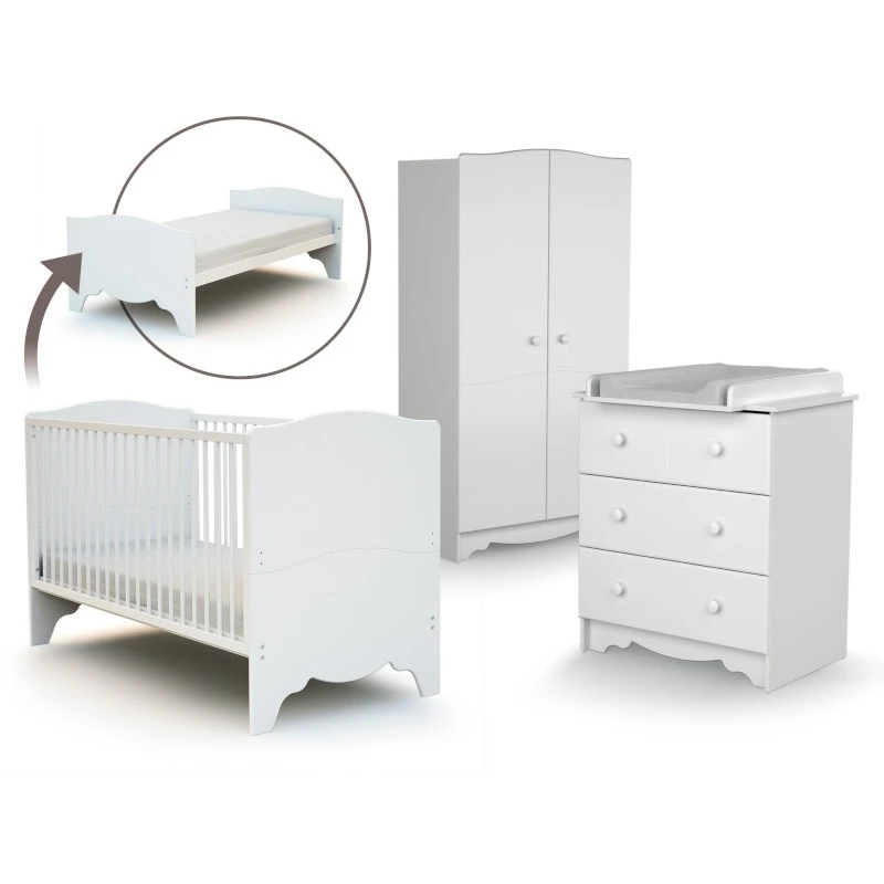 Il est accompagné par une belle commode composée de 3 grands tiroirs qui accueillera toutes les petites affaires de bébé et permettra de les garder à portée de main.