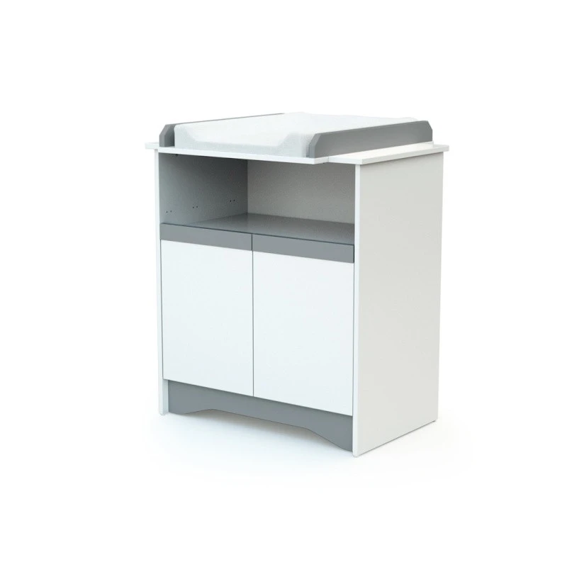Il est accompagné d’un beau meuble à langer au design chic composé d’un large espace de rangement avec une niche ouverte et de deux portes en partie basse pour pouvoir accueillir toutes les petites affaires de bébé et ainsi les garder à portée de main !