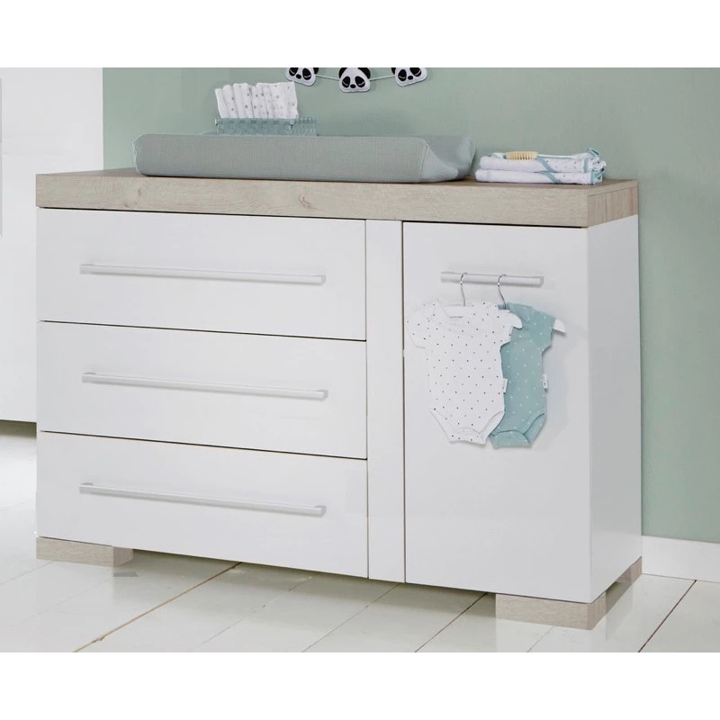 Il est accompagné par la belle commode Stromboli. Originale et très spacieuse grâce à ses 3 grands tiroir et son placard contenant 1étagère, elle accueille toutes les petites affaires de bébé et permet de les garder à portée de main.