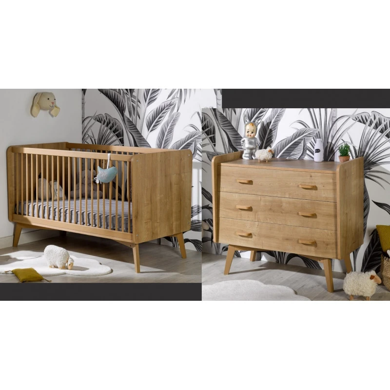 Il est accompagnĂ© d’une grande commode assortie, très spacieuse grâce Ă ses 3 grands tiroirs, qui accueille toutes les petites affaires de bĂ©bĂ© et permet de les garder Ă portĂ©e de main. Â
