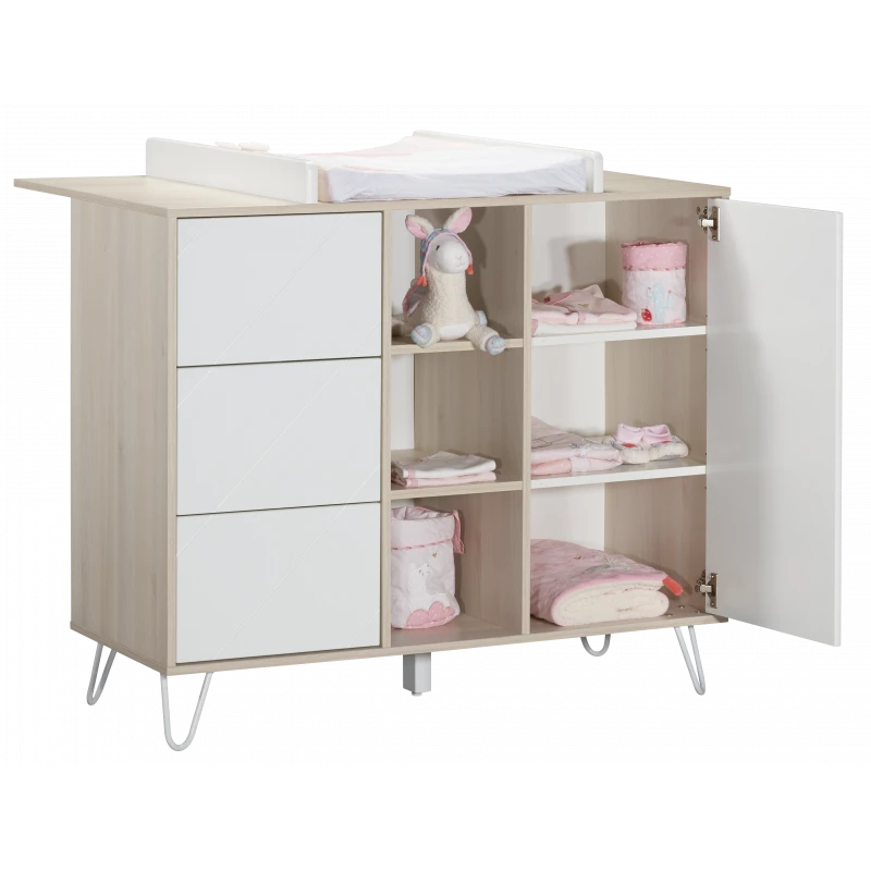 Cette belle commode assortie Ă la nouvelle collection Happy de Sauthon est extrèmement spacieuse. Elle est composĂ©e de 3 tiroirs, 3 niches et d’une petite porte cachant 3 Ă©tagères. Elle accueillera toutes les petites affaires de bĂ©bĂ© et vous permettra de les garder Ă portĂ©e de main. Avec son design simple et Ă©purĂ©, la commode Hello conçue par Sauthon est Ă©galement très pratique. En effet, vous pourrez la transformer en commode Ă langer en fixant simplement le plan Ă langer assorti Ă la collection (en option). Vous pourrez ainsi profiter d’un espace de langer confortable et sĂ©curisĂ© pour vous occuper de bĂ©bĂ© en toute sĂ©rĂ©nitĂ©. Afin d’utiliser la commode en toute sĂ©curitĂ©, elle doit ĂŞtre fixĂ©e au mur (sangle fournie). Petit plus Sauthon très pratique: les tiroirs sont Ă©quipĂ©s du système push!
