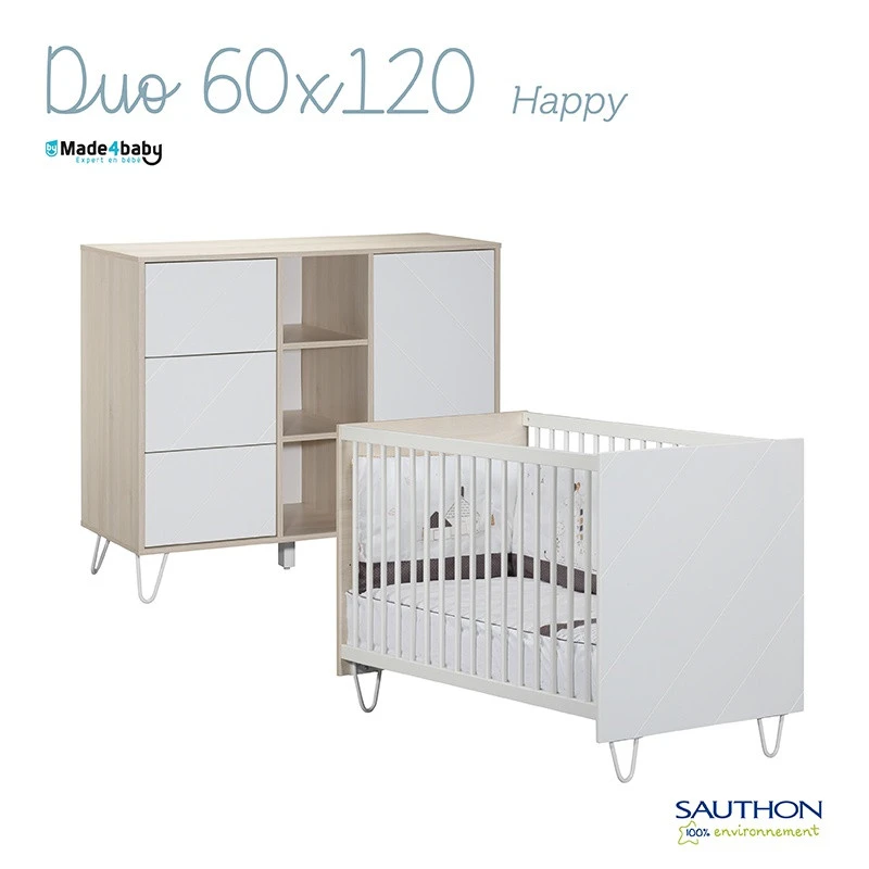 DĂ©couvrez la superbe chambre Happy par Sauthon, un petit Ă©crin de douceur spĂ©cialement Ă©tudiĂ©e pour le confort et la sĂ©cutitĂ© de votre petit trĂ©sor. Grace Ă son design simple et Ă©purĂ©, elle fera le bonheur d’un petit garçon ou d’une petite fille ! Dans les tons de blanc laquĂ© et d’acacia clair, elle est dĂ©corĂ©e par de jolies gravures, et ses beaux pieds en mĂ©tal blanc apportent une jolie touche d’originalitĂ© ! Belle et robuste, la chambre Happy propose des volumes gĂ©nĂ©reux et des prestations Ă la hauteur de Sauthon. Des lignes minimalistes et Ă©lĂ©gantes pour une chambre fonctionnelle qui s’intègrera dans tous les univers !