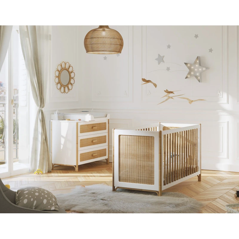 Il est accompagné de la commode Océania par Théo, composée de trois grands tiroirs. Elle est conçue dans un harmonieux mélange entre le bois et le tressage de rotin qui est présent sur les façades de ses tiroirs. Ces tiroirs, équipés de fermetures douces, vous permettront de ranger toutes les petites affaires de bébé, vêtements, draps, nécessaire de change ou encore ses jouets ! Parfait pour garder la chambre de bébé bien rangée. De plus, ses pieds en canne de rotin apporteront une jolie touche de douceur à cette belle commode !