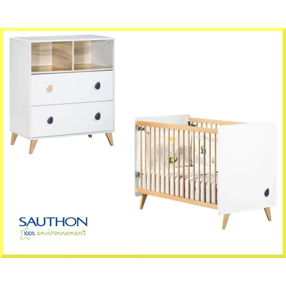 Comme un petit air de Scandinavie souffle chez Sauthon avec cette chambre Duo Oslo qui rĂ©uni les essentiels de la collection: la commode et le lit 60×120. Très spacieuse grâce Ă ses 2 tiroirs et 2 niches, la commode accueille toutes les petites affaires de bĂ©bĂ© et permet de les garder Ă portĂ©e de main. Pièce maĂ®tresse de la chambre de bĂ©bĂ©, le lit Oslo en finition blanc laquĂ© s’intègre parfaitement Ă tous les intĂ©rieurs et ses pieds obliques apportent une jolie touche d’originalitĂ©. La finition laquĂ©e blanc permet Ă la chambre Oslo Sauthon de s’intĂ©grer parfaitement Ă tous les intĂ©rieurs pour crĂ©er Ă bĂ©bĂ© une chambre accueillante et rĂ©confortante. La chambre Oslo par Sauthon est disponible avec poignĂ©es « étoile » ou poignĂ©es « goutte d’eau ». Pour une fille ou pour un garçon, tout se joue dans la dĂ©coration.