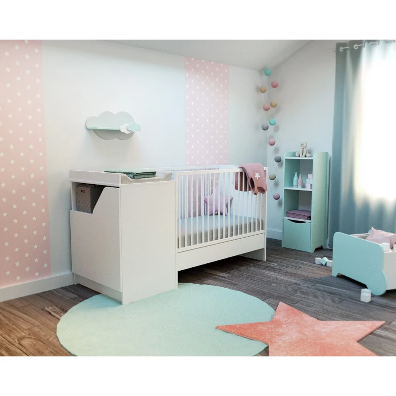 Ce beau lit est accompagné du meuble à langer Carnaval dans laquelle vous pourrez ranger les petites affaires de bébé grâce ses étagères et sa niche de rangement.