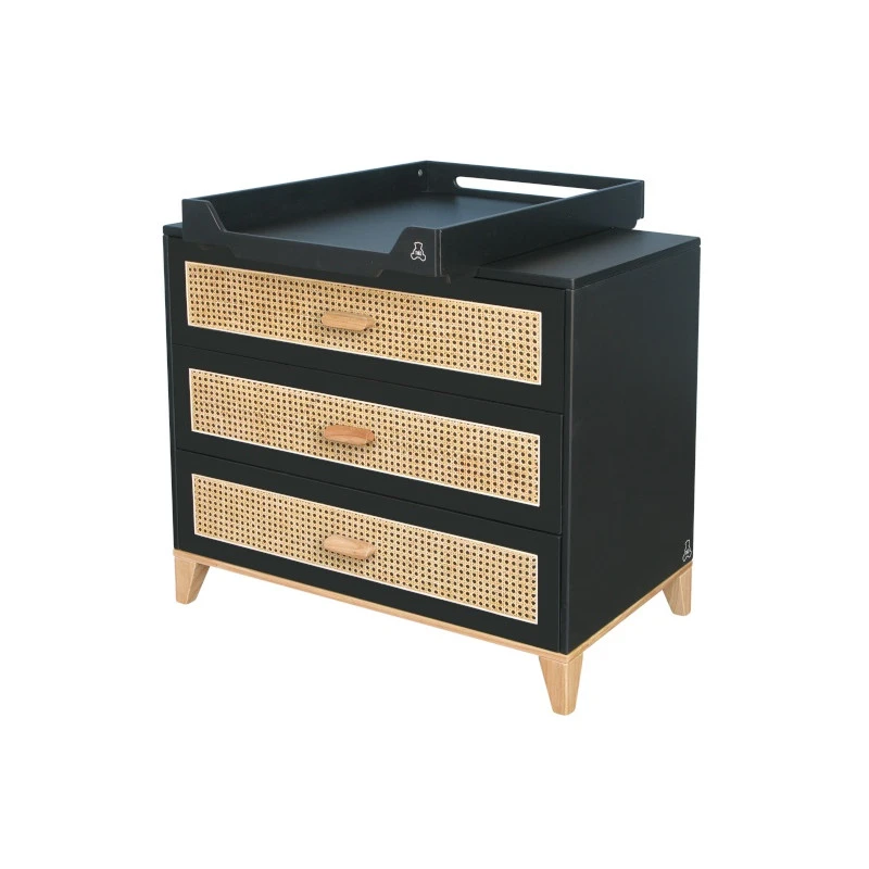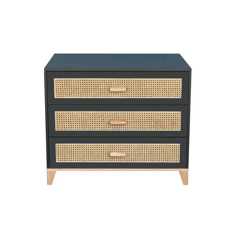 La commode Nami par Théo, est composée de trois grands tiroirs raffinés. Elle est conçue dans un harmonieux mélange entre le bois et le cannage de rotin naturel qui est présent sur les façades de ses tiroirs. Ces tiroirs, équipés de fermetures douces, vous permettront de ranger toutes les petites affaires de bébé, vêtements, draps, nécessaire de change ou encore ses jouets ! Parfait pour garder la chambre de bébé bien rangée. De plus, ses poignées et ses pieds en bois massifs en cèdre blanc apporteront une jolie touche de douceur à cette belle commode !