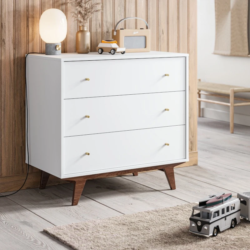 Vox vous présente la commode Mid avec ses 3 grands tiroirs tellement pratiques pour organiser soigneusement les affaires de bébé, ainsi que pour les retrouver rapidement : les couches et le nécessaire de toilette sur un niveau, les pyjamas et sous-vêtements sur un autre, les habits de jour sur le dernier, par exemple.