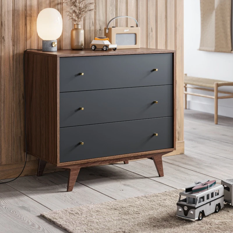 Vox vous présente la commode Mid avec ses 3 grands tiroirs tellement pratiques pour organiser soigneusement les affaires de bébé, ainsi que pour les retrouver rapidement : les couches et le nécessaire de toilette sur un niveau, les pyjamas et sous-vêtements sur un autre, les habits de jour sur le dernier, par exemple.