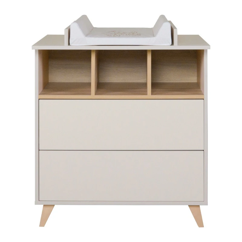 La commode Loft par Quax, composée de 2 tiroirs et de 3 niches vous permet de ranger les petites affaires de bébé tout en gardant à portée de main tous les produits indispensables !