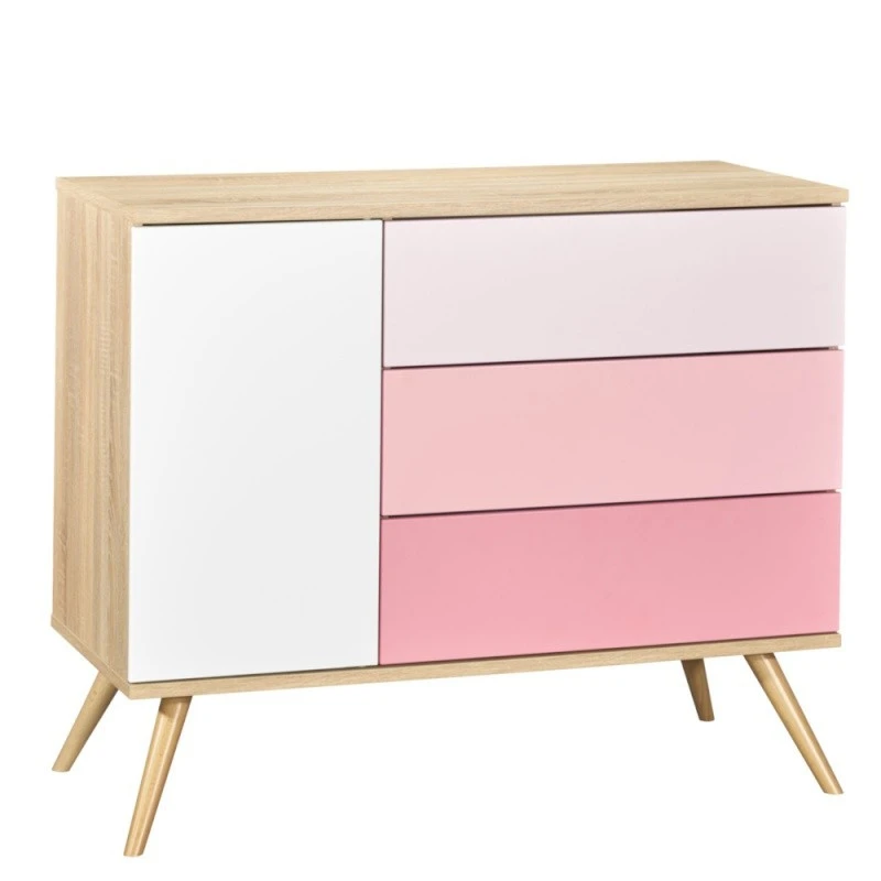 Cette belle commode assortie à la collection Seventies de Sauthon est très spacieuse. Elle est composée d’une porte et de 3 tiroirs. Elle accueillera toutes les petites affaires de bébé et vous permettra de les garder à portée de main. Avec son design doux et rétro, la commode Seventies conçue par Sauthon est également très pratique. En effet, vous pourrez la transformer en commode à langer en fixant simplement le plan à langer assorti à la collection (en option). Vous pourrez ainsi profiter d’un espace de langer confortable et sécurisé pour vous occuper de bébé en toute sérénité. Afin d’utiliser la commode en toute sécurité, elle doit être fixée au mur (sangle fournie). Petit plus Sauthon très pratique: les tiroirs sont équipés du système push!