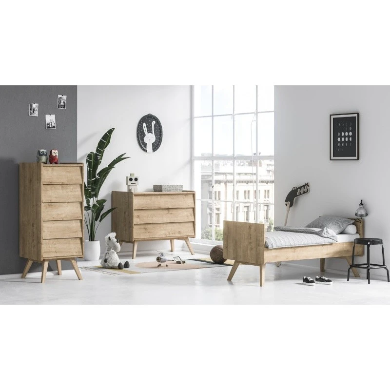 Découvrez la superbe chambre Vintage, fabriquée par Vox à partir de bois de Chêne massif. Dans un style rétro très à la mode, cette belle chambre s’inspire des années 50 pour créer un univers qui plaira aussi bien aux filles qu’aux garçons. Elégante et originale, dans les tons de chêne naturel, elle se fondra dans toutes les décorations ! Grâce à la chambre Vintage, offrez à votre tout-petit un espace chaleureux et fonctionnel dans lequel il fait bon vivre ! Cette jolie chambre se décline en un lit bébé 60×120 ou un lit 70×140 évolutif que vous pouvez accompagner par une belle commode et un chiffonnier en chêne naturel pour un rendu très tendance ! La petite touche déco en plus : les pieds inclinés en bois massif déclinés sur tous les éléments de la chambre Vintage !