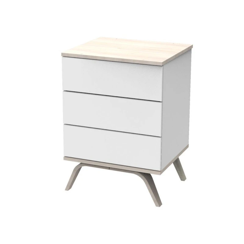 Composition : panneau de fibres médium densité (MDF) laqué – panneau de particules revêtu papier décor Acacia clair – hêtre massif laqué – panneau de particules mélaminés décor Blanc – hêtre massif verni