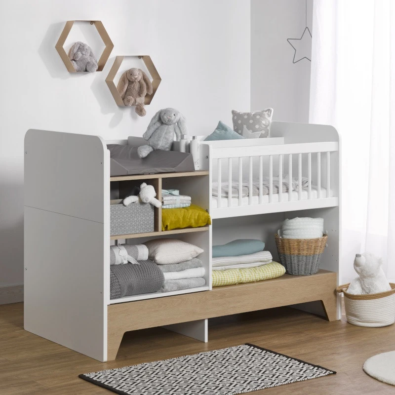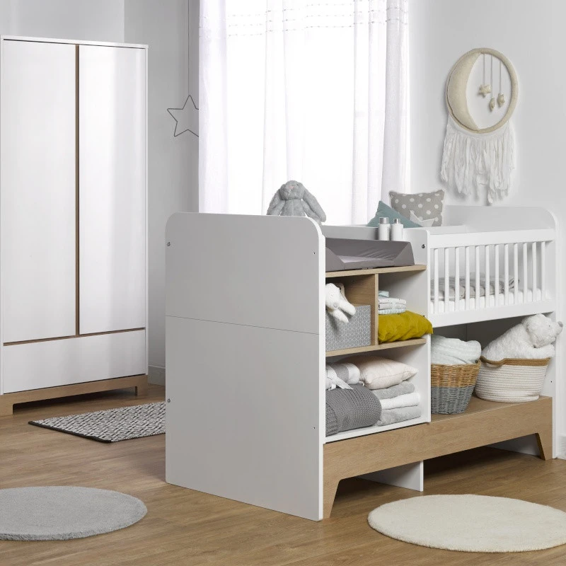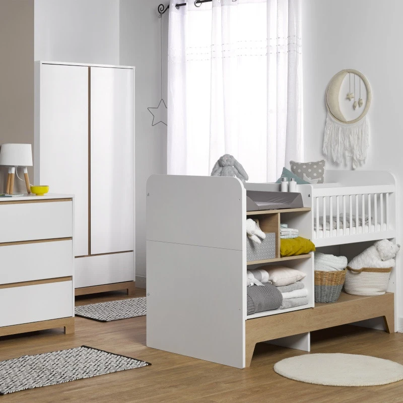Ce lit combiné transformable est très doux. Dans les tons de blanc et de chêne, il se fondra dans tous les univers et s’adaptera à tous les thèmes de chambre.