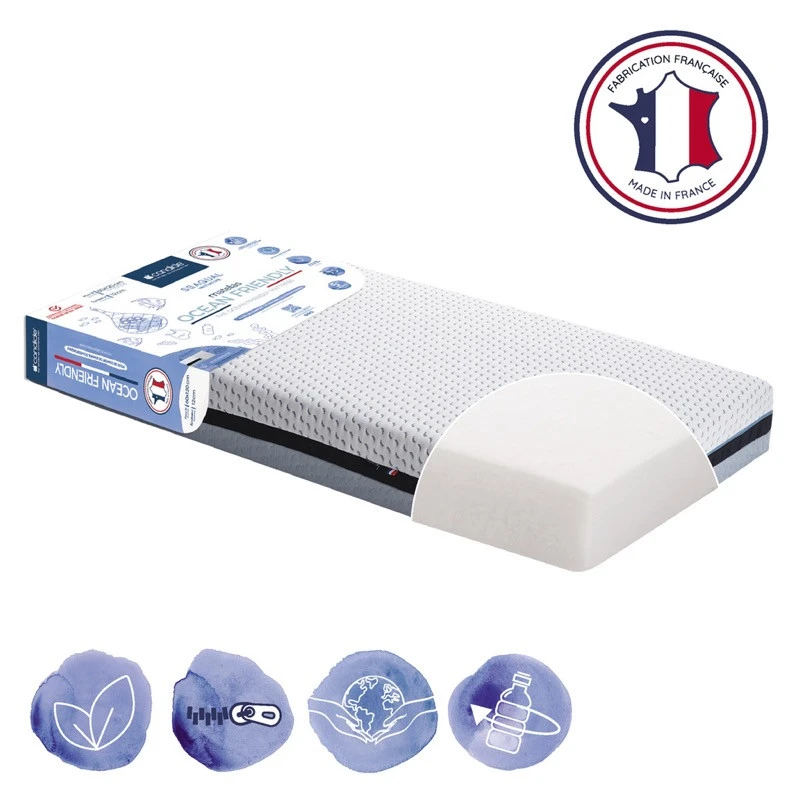 L’âme du matelas 60×120 cm Ocean Friendly Candide est quant à elle constituée d’un bloc de fibres de polyester recyclées, et soutient parfaitement la colonne vertébrale de votre bout de chou durant son sommeil. Gardez en mémoire que votre enfant passe beaucoup de temps dans son lit, au cours de ses 3 premières années ! Ce matelas dispose ainsi d’une densité de 20kg/m3, qui offre un couchage confortable, accueillant et relativement ferme, selon les recommandations du corps médical. Il garantit un sommeil de qualité, indispensable au développement de votre petit.