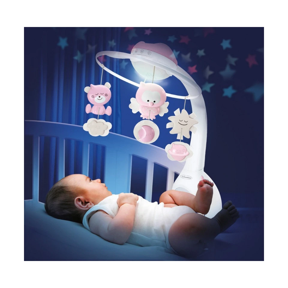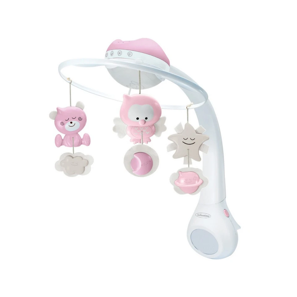 Découvrez le mobile Douce Nuit 3en1 Rose par Infantino, joli mobile utilisable dès la naissance avec ses 6 mélodies, 4 sons de la nature et des projections multicolores, il enchantera votre tout petit et l’accompagnera au pays des rêves enchantés. Dès 6 mois, il se transforme en veilleuse, tout engardant la musique, les jolies projections au plafond et un miroir qui amusera bébé. Enfin, vous pourrez ensuite le transformer en lame de chevet et projecteur mural dès l’âge de 18mois. Il est très facile à monter et vous pourrez passer d’un mode à l’autre en quelques secondes en appuyant tout simplement sur les boutons pour le déclipser. Il est également simple d’utilisation, gros plus: le volume du son est réglable!