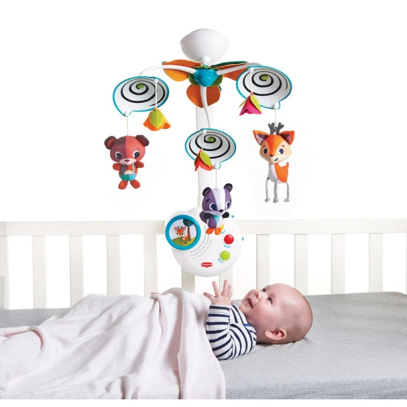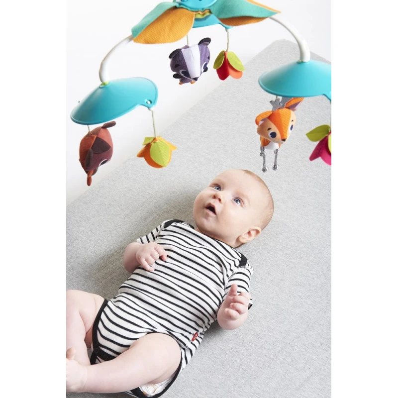 Bébé bien installé dans son lit vit une véritable fête sensorielle de musique, de couleurs et de mouvements. Les spirales noires et blanches du mobile Classic Dans la forêt de Tiny Love développent l’acuité visuelle de votre bébé. Ses mouvements novateurs contribuent à renforcer ses muscles oculaires. Bébé pourra profiter de 20 minutes de musique classique en continue, pour s’éveiller ou s’endormir en douceur. Lorsque bébé aura grandit, vous pourrez enlever le bras du mobile, bébé possède maintenant une véritable boite à musique qu’il pourra emporter partout.