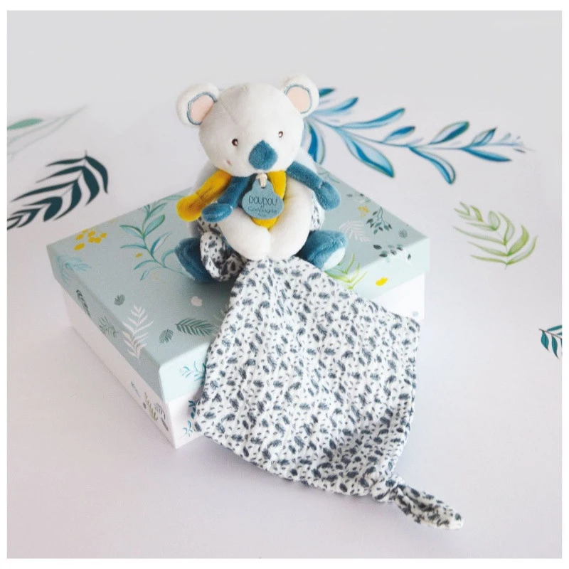 Le pantin avec doudou Doudou et Compagnie Yoca le koala est une petite peluche, tenant dans ses mains un carré de tissu plat et souple, facile à attraper par des mains de nourrisson. Il associe harmonieusement des matières douces et des touches de lange aux motifs végétaux, le tout dans de jolies couleurs tendance blanc, bleu et jaune. Les multiples petits nœuds ainsi que les délicates étiquettes en forme de feuilles aident bébé à préciser ses gestes en les attrapant, et se laissent caresser avec plaisir pour s’endormir paisiblement.