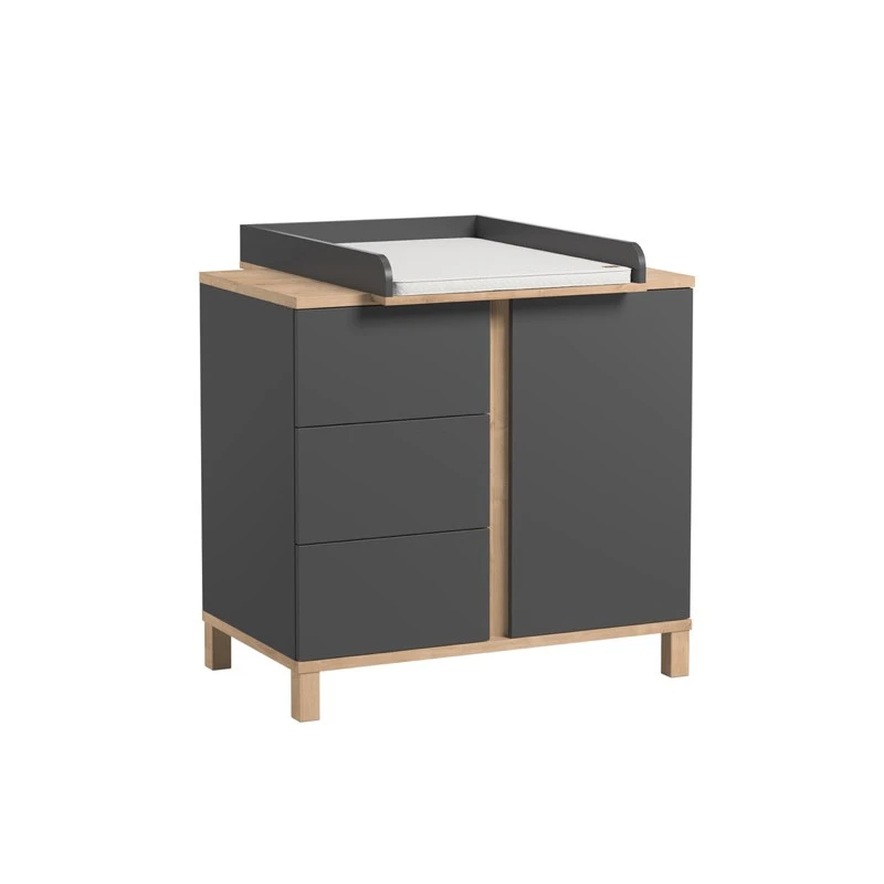 Le plan à langer Vox Altitude graphite/bois associe élégamment la couleur gris foncé et le chêne massif, pour se coordonner parfaitement aux autres éléments de la même collection. Vous y retrouvez un lit 60 x 120 cm ou 70 x 140 cm, une commode 1 porte, 3 tiroirs sur laquelle s’installe ce plan à langer ainsi qu’une armoire 2 portes.