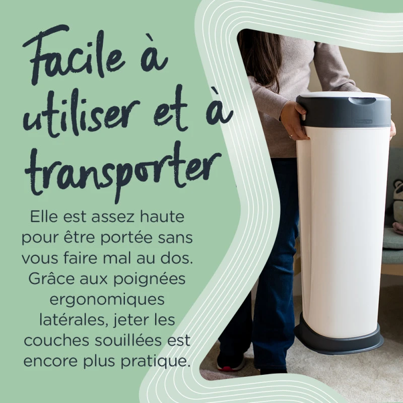 La hauteur de la poubelle (76cm) est adaptée pour vous éviter d’avoir à vous baisser ou à trop vous pencher vers le bas, et vous permettre de la porter sans vous faire mal au dos. Facile à utiliser et à vider, cette grande poubelle est fournie avec une recharge préinstallée et chaque recharge fournit une quantité suffisante de film antibactérien pour envelopper vos couches pendant environ 1 mois*. De taille XL, cette poubelle peut contenir jusqu’à 60 couches à la fois*, alors plus besoin de sortir les poubelles aussi souvent.