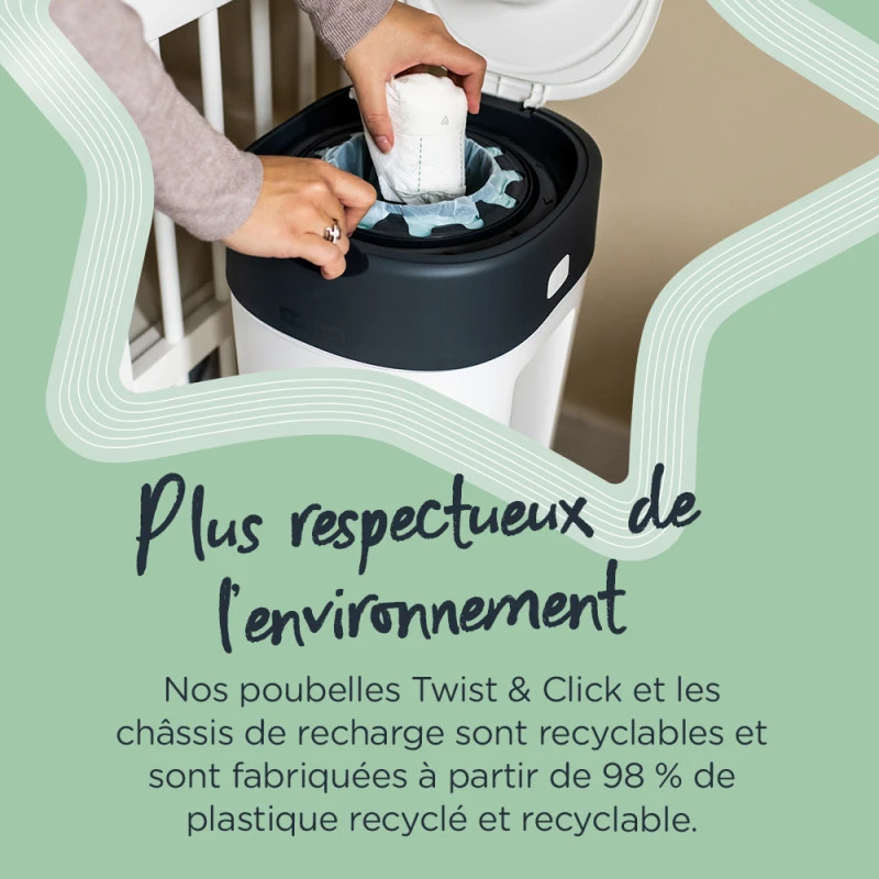 Cette poubelle est équipée d’un plongeoir intégré qui vous permet de pousser la couche au fond de la poubelle tout en gardant les mains propres. Afin de réduire leur impact sur l’environnement, la poubelle à couches Twist & Click et le châssis de recharge sont fabriqués à partir de 98 % de plastique recyclé et sont entièrement recyclables. Le GREENFILM™ multicouches et antibactérien est désormais biosourcé et conçu à partir de canne à sucre exploitée de manière durable.