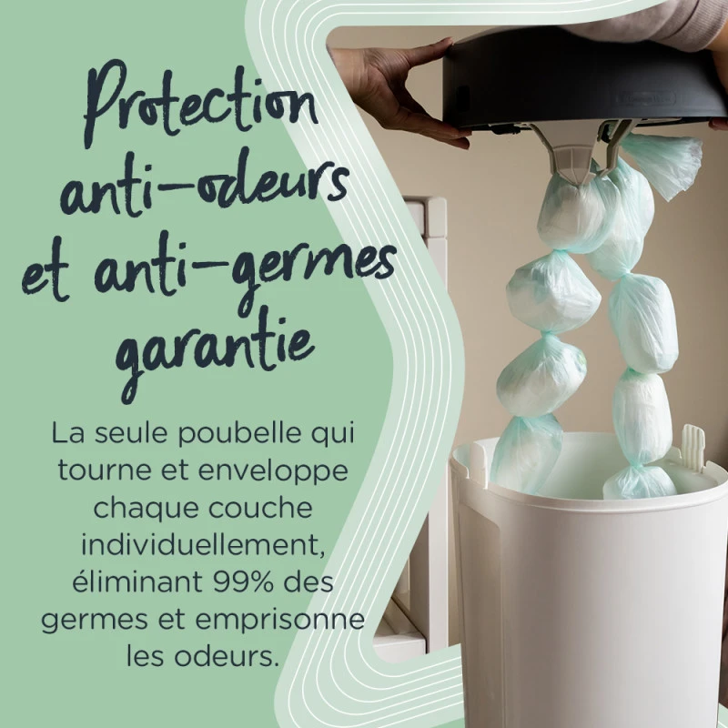 La poubelle Sangenic Twist & Click XL, un système innovant qui vous offre une protection antibactérienne contre les odeurs et les microbes en emballant chaque couche individuellement et hermétiquement en quelques secondes dans un film multi-épaisseurs antibactérien. Il vous suffit de passer la couche par le plongeoir intégré pour garder les mains propres et la maison saine. Ce film antibactérien élimine 99% des germes pour éviter la propagation des bactéries. Le couvercle de la poubelle à couches Twist & Click emprisonne toutes les odeurs désagréables.
