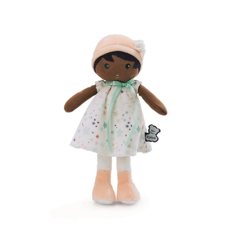 La poupée Large Manon K Kaloo Tendresse est vêtue d’une superbe robe aux multiples étoiles multicolores et pastel. De nombreux détails raffinés la rendent encore plus élégante, tels ses bottines couleur pêche coordonnées à son chapeau, sa jolie fleur sur la tête assortie à sa robe ou encore son délicat ruban autour du cou.