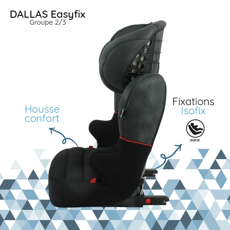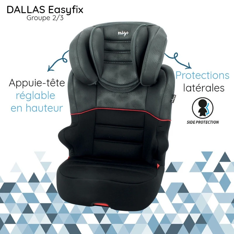 Le siège auto Dallas Easyfix par Migo, homologué de 15 à 36 kg, est idéal pour les enfants dès 4 ans jusqu’à 10 ans. Équipé du système ISOFIX avec Top Tether, le siège auto Dallas Easyfix s’installe facilement et sans risque d’erreur, offrant ainsi une protection optimale et une stabilité totale en cas de collision. Ce siège auto Migo s’installe à l’arrière du véhicule et s’utilise sans harnais, en attachant l’enfant avec la ceinture de sécurité 3 points de la voiture. Confortable grâce à son habillage très doux, il est muni d’un coussin de tête rembourré pour un maximum de maintien. Simple d’utilisation, ses accoudoirs courts permettent à votre enfant de s’installer et de s’attacher seul le moment venu. Le siège auto Dallas Easyfix par Migo est fabriqué en France et est homologué selon la norme ECE R44/04.