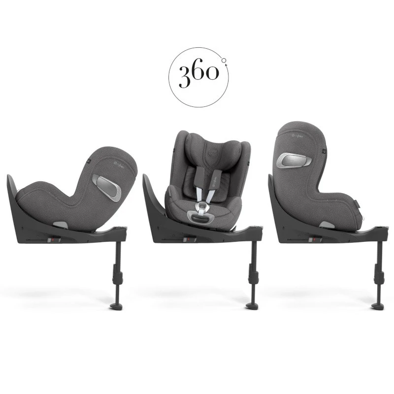 Il est équipé d’une fonction rotation lorsqu’il est utilisé avec la base auto T (vendue séparément) pour pivoter à 360°, afin d’installer ou de retirer votre enfant facilement de son siège lorsqu’il est en voiture. La fonction rotation permet également de passer votre siège auto Sirona T de la position dos à la route à la position face à la route. Pratique, le siège peut pivoter même lorsqu’il est incliné !