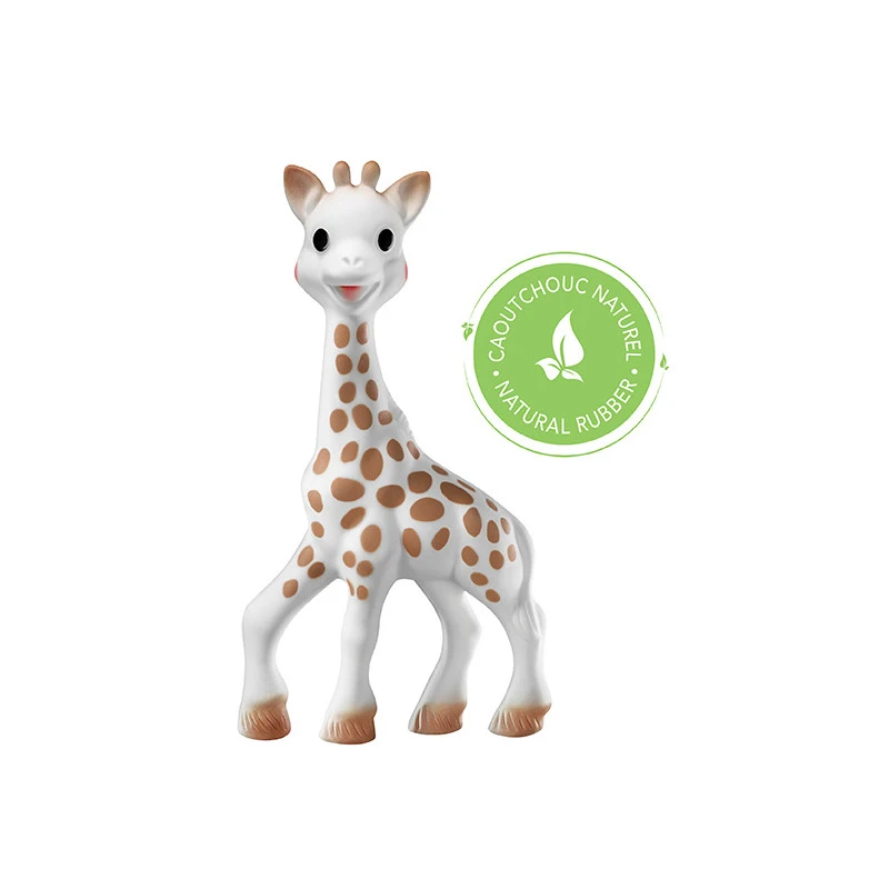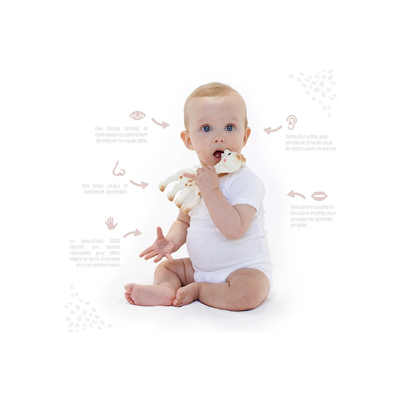 Avec ses grandes pattes, ses oreilles toutes mignonnes et son long cou, Sophie la girafe Vulli est facile Ă saisir et Ă manipuler par de petites mains. Bien souple, elle est aussi agrĂ©able Ă mâchouiller, dès que surviennent les premières poussĂ©es dentaires…sans oublier l’odeur unique et rassurante du caoutchouc naturel.Â