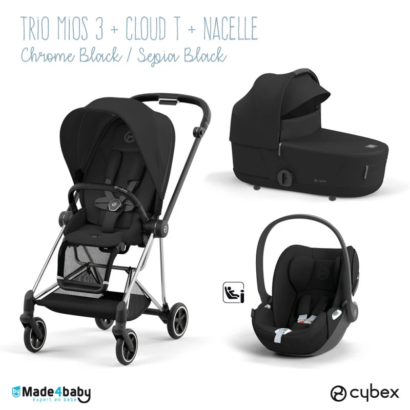 Cet ensemble Trio de Cybex est composé de la poussette Mios 3 (structure et habillage du siège), de la nacelle luxe Mios 3 et du siège-auto Cloud T de Cybex… Un ensemble de promenade complet, tout confort !