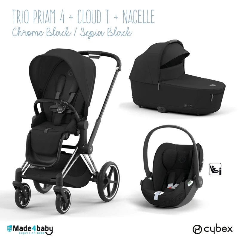 Nous vous proposons cet ensemble Cybex trio composé du châssis Priam, de l’armature d’assise, de l’habillage, du siège auto Cloud T et de la nacelle Luxe, un carrosse 5 étoiles pour bébé !