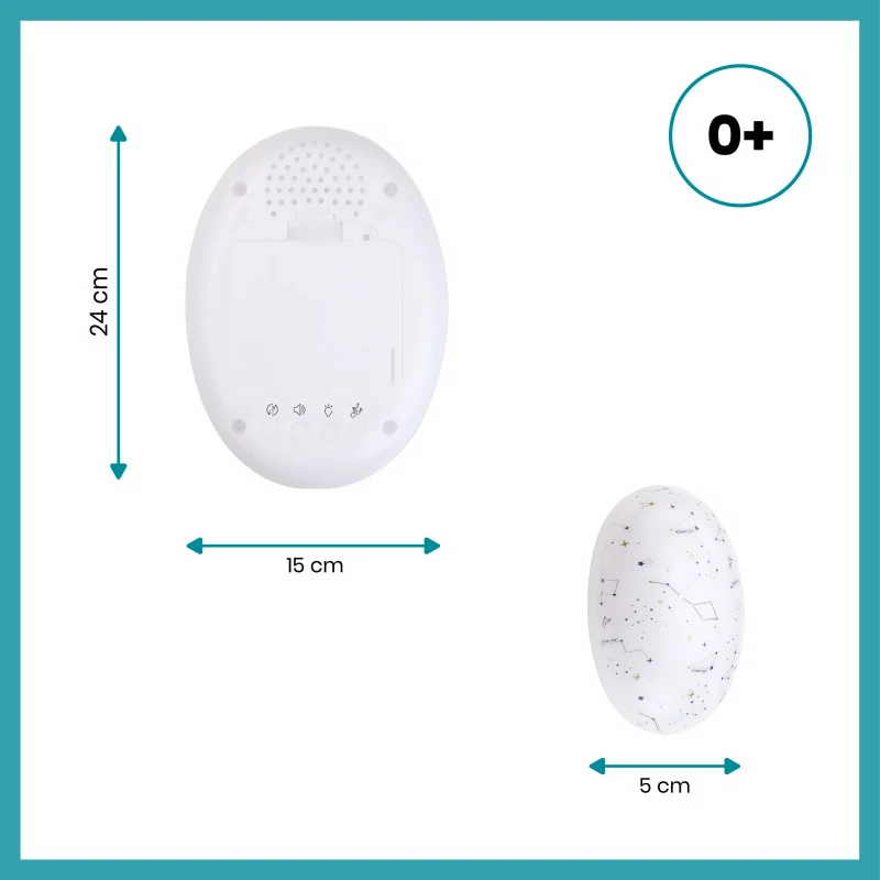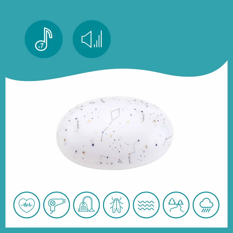 - 7 sons au choix : aspirateur, battement de cœur, pluie, mer, rivière, sèche-cheveux ou insectes.